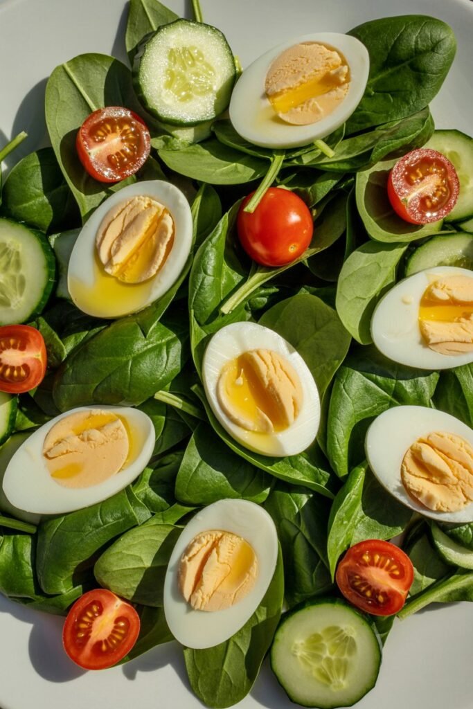 Wash and dry the spinach, then place it in a bowl. Slice or chop the boiled eggs and arrange them over the greens.