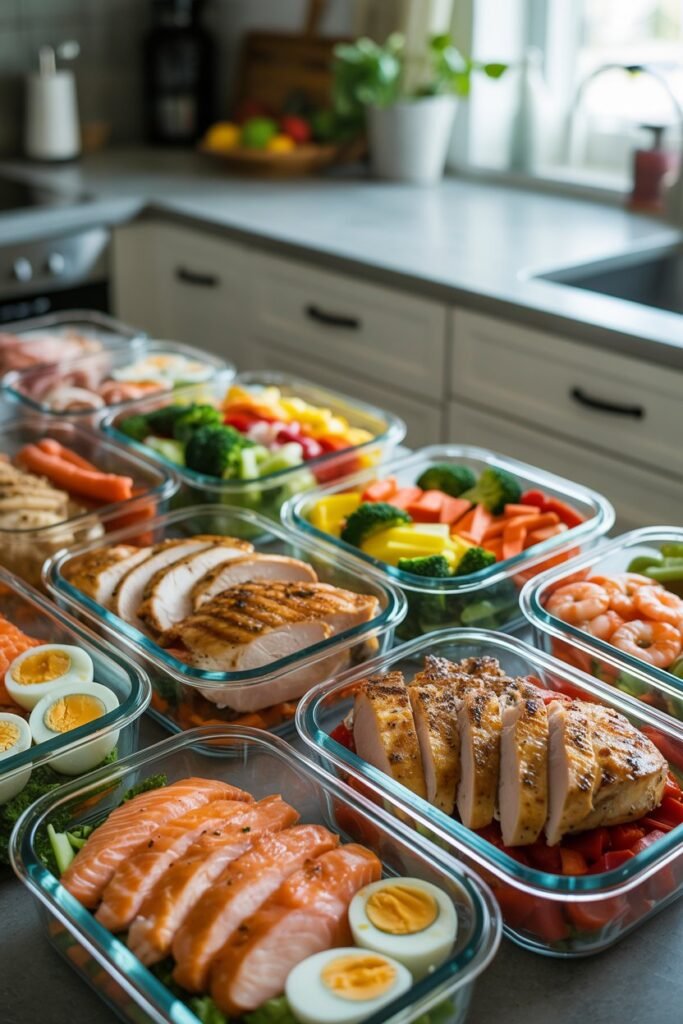 • Cook proteins at once: Bake or grill chicken, turkey, salmon, boil eggs, and cook shrimp.