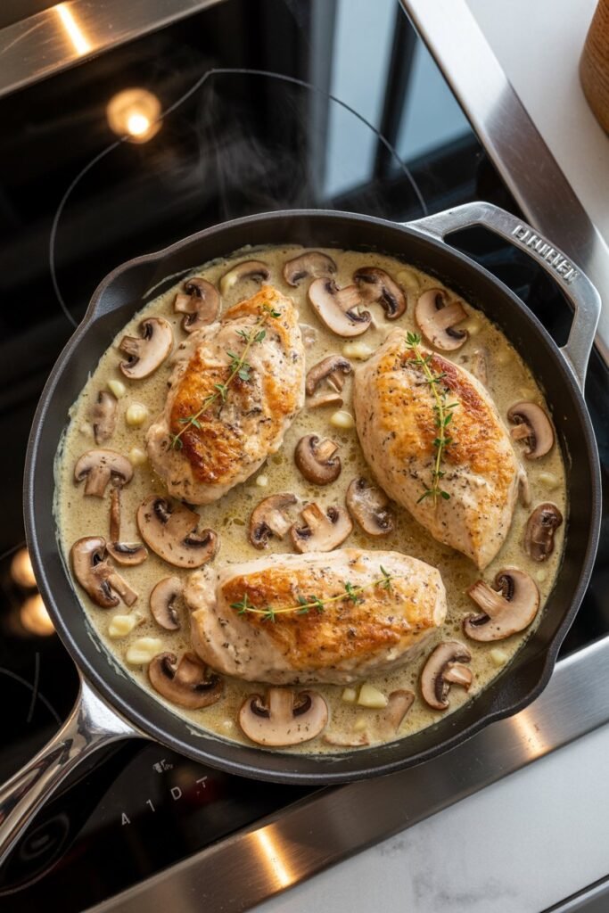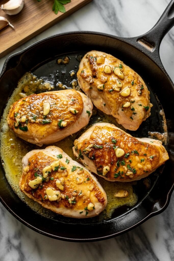 The chicken cooks in a rich garlic butter sauce that keeps it juicy and tender.