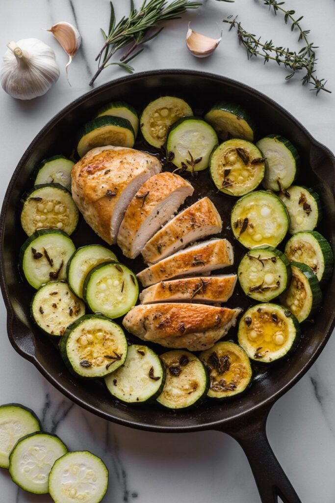 This one pan skillet meal is perfect for busy nights. The zucchini cooks quickly and absorbs the flavor from the seasoned chicken.
