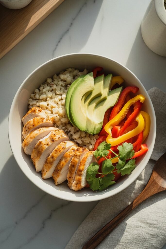 This simple bowl combines seasoned chicken with cauliflower rice and vegetables for a balanced keto meal.