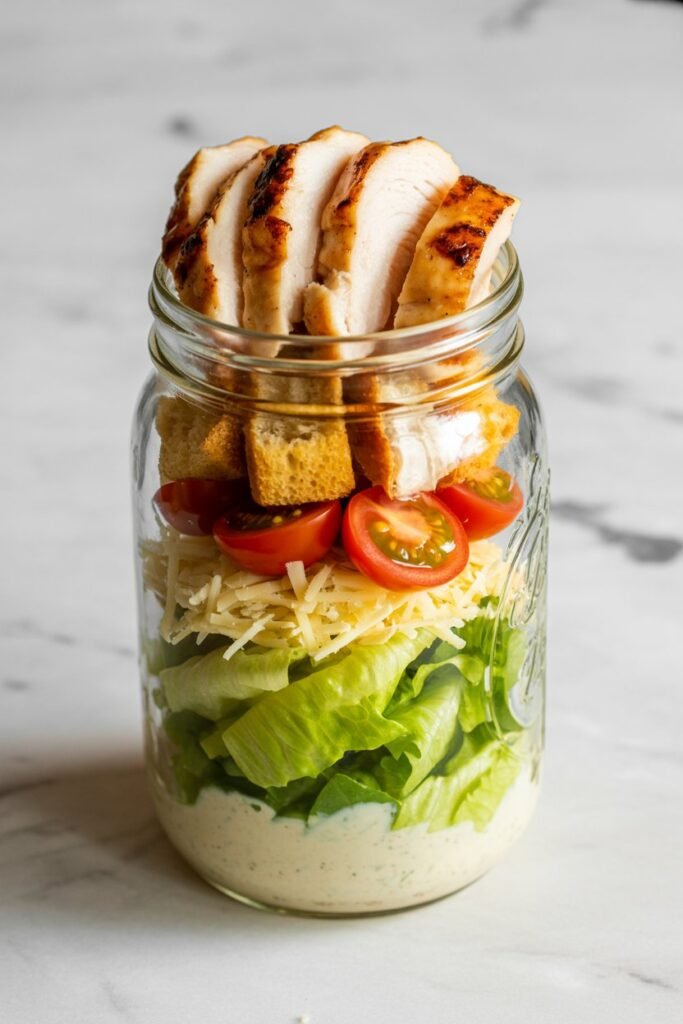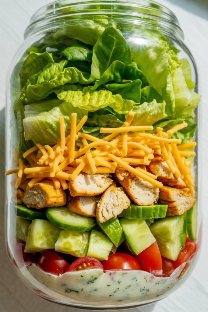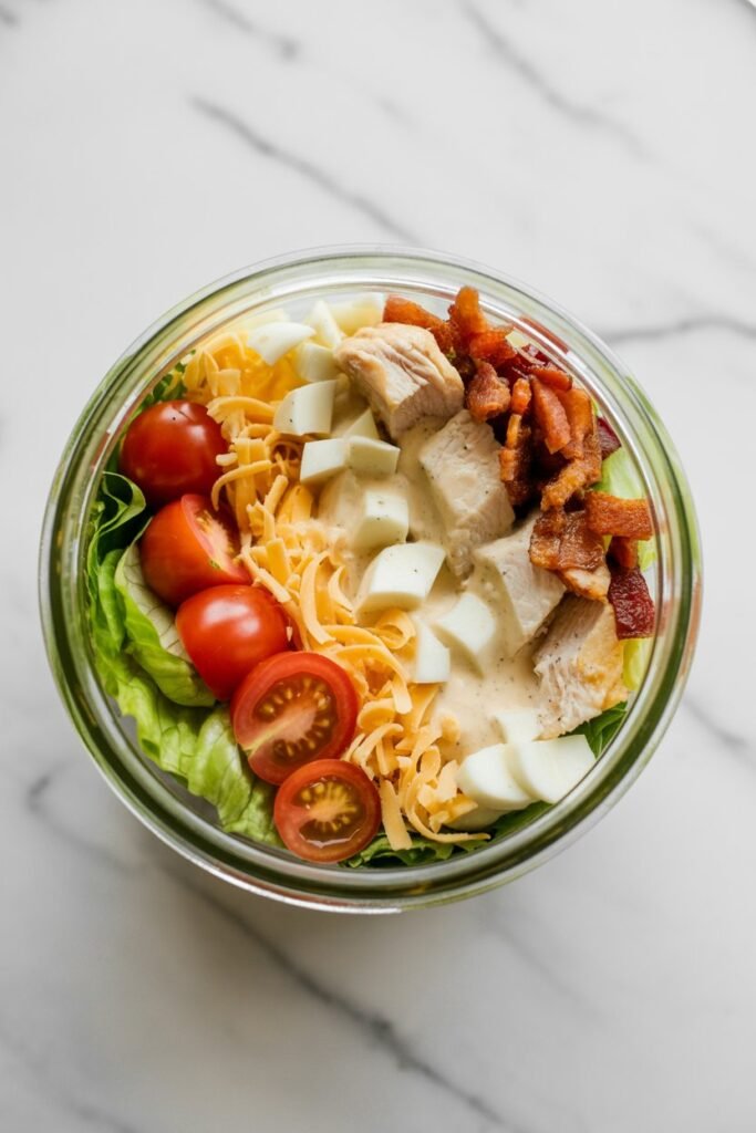 What I like about this version is that the jar layering keeps the lettuce crisp while the heavier ingredients sit closer to the dressing. When you shake the jar, everything mixes together beautifully.