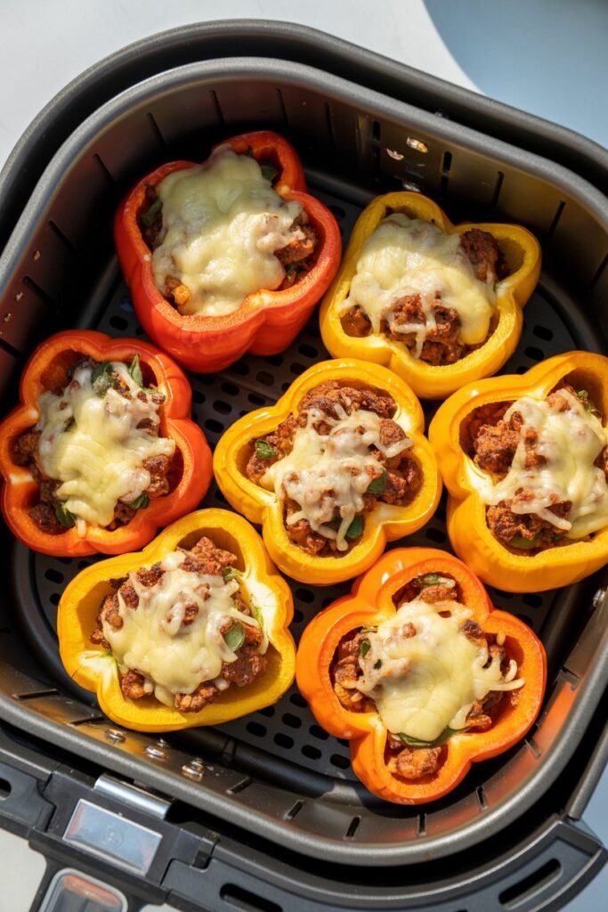 Place peppers in the basket and cook for 12–15 minutes until the peppers are tender and cheese is melted. Serve warm.
