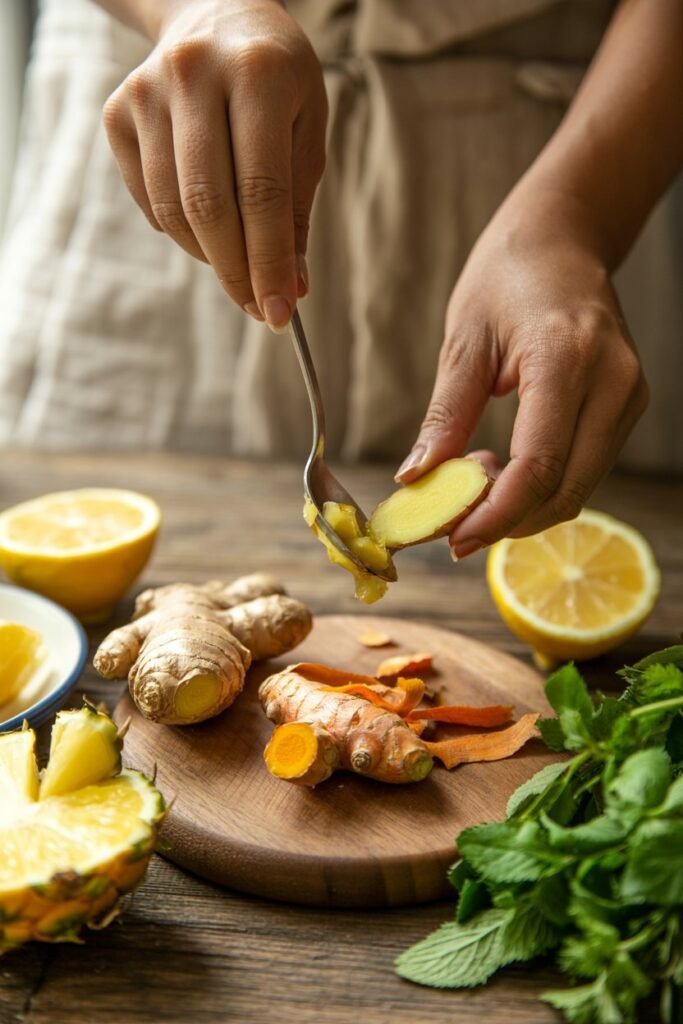 - Fresh ginger root – This is the star ingredient. Ginger contains compounds called gingerols that are known for their anti-inflammatory and antioxidant properties. Fresh ginger also helps soothe the digestive system, reduce bloating, and improve circulation. I always peel mine carefully using a spoon to avoid wasting any of the root.