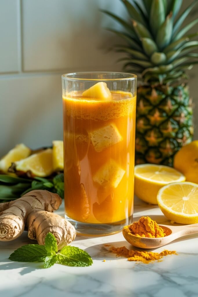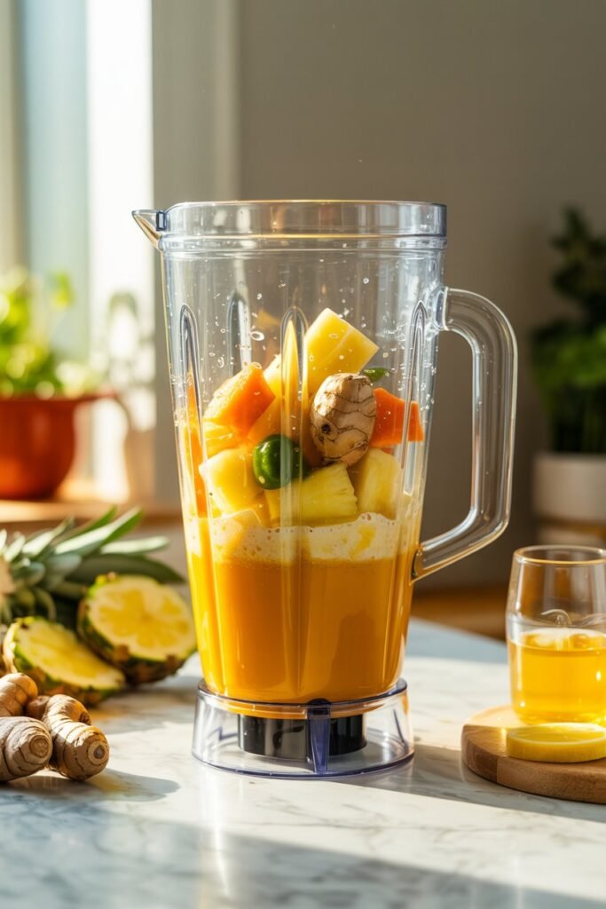 - Pineapple or orange juice – A little natural sweetness balances the strong, earthy flavors of ginger and turmeric. Pineapple also contains bromelain, an enzyme that can help with digestion and inflammation.