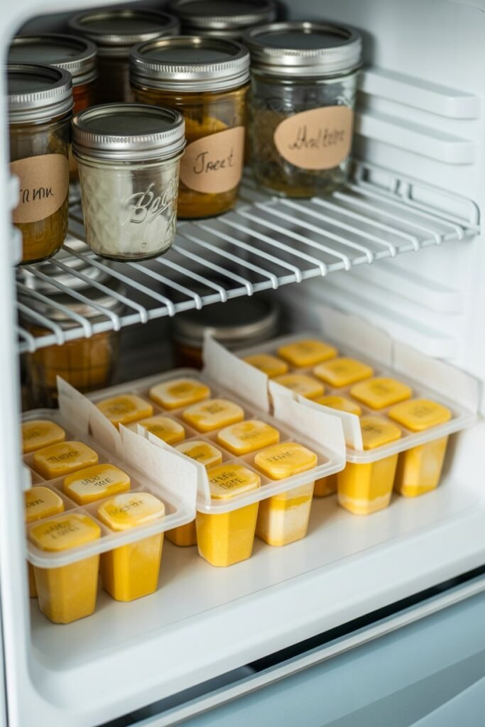 Place the trays in the freezer for at least 4 to 6 hours or overnight. Once frozen, pop the cubes out carefully and store them in a labeled freezer-safe bag or container.