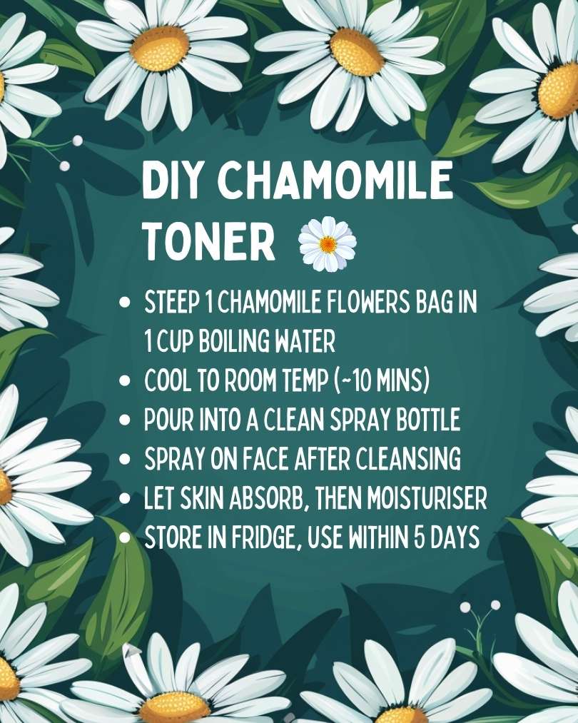 • How to use: Make a chamomile infusion, let it cool, and apply it to the skin with a clean cloth. For acne, eczema, or sunburn relief, try chamomile compresses.