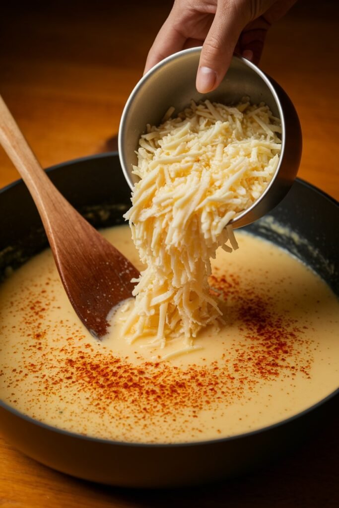 Pour in the heavy cream and bring it gently to a simmer, letting it warm and thicken slightly. Then, add the shredded mozzarella and Parmesan cheese, stirring continuously until the mixture is perfectly melted, smooth, and creamy.