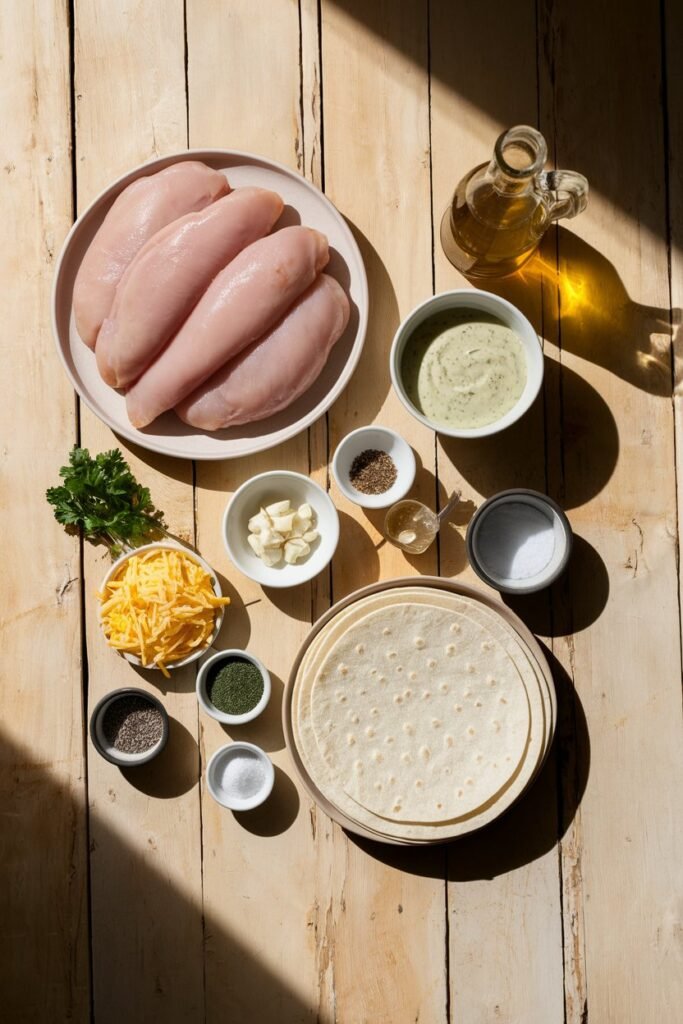 To make these cheesy garlic chicken wraps, you’ll need simple ingredients that come together for an explosion of flavor: