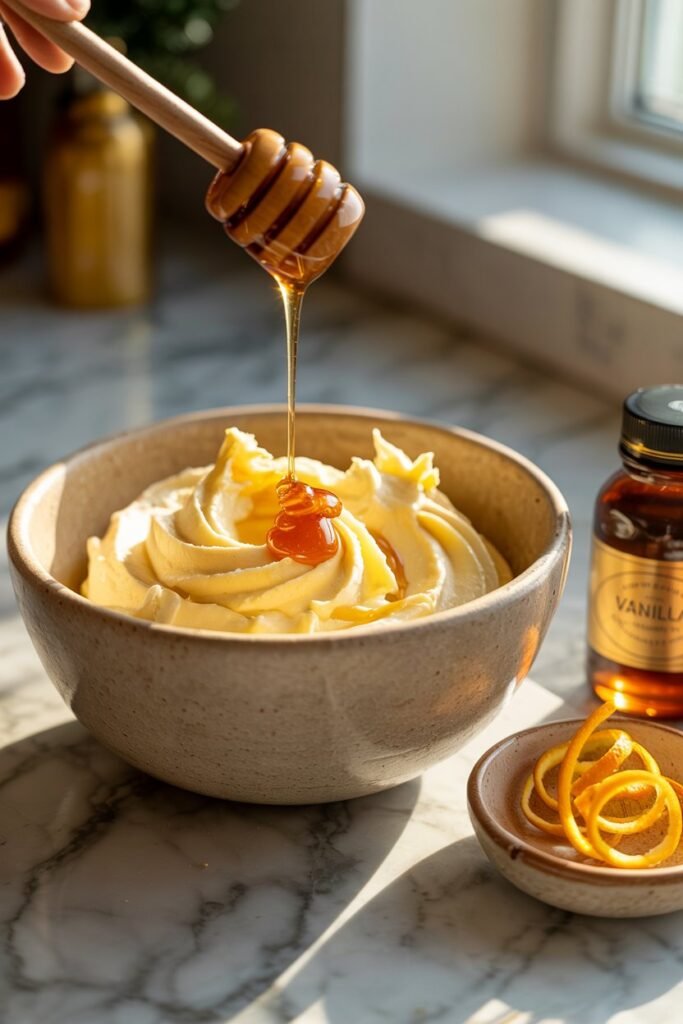 Once your butter is creamy, add 3–4 tablespoons of honey, 1 teaspoon of vanilla extract, and the orange zest. Mix on low speed until fully combined. Taste at this point—if you want it sweeter, add a little more honey.