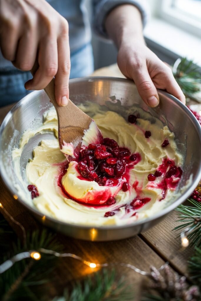 Gently fold in the prepared cranberries using a spatula. You want to keep the cranberries slightly chunky so each bite has bursts of tart flavor and a festive red color.
