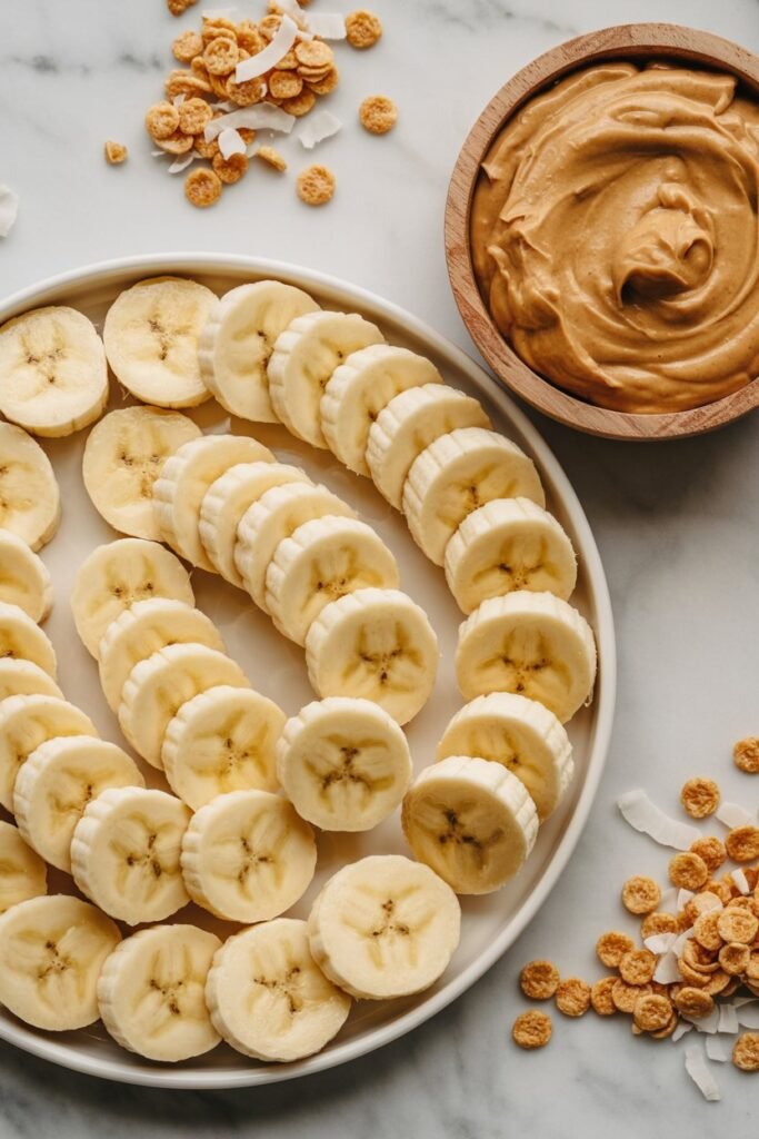 This helps the toppings stick and adds extra flavor and protein. Then roll each banana slice in crushed cereal, coconut, or mini chocolate chips.