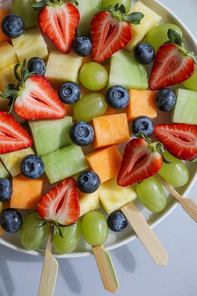 Wash all fruit thoroughly and cut into bite-sized pieces. Let kids thread the fruit onto skewers, creating colorful patterns.