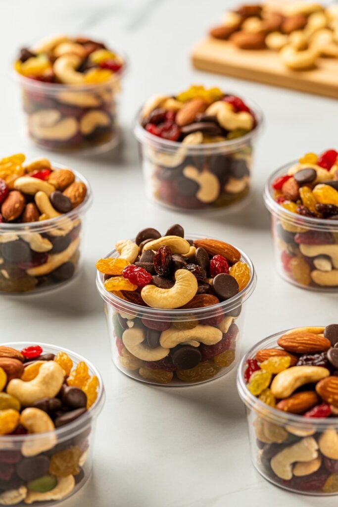 Once combined, transfer the trail mix into small containers or snack bags for easy grab-and-go options.