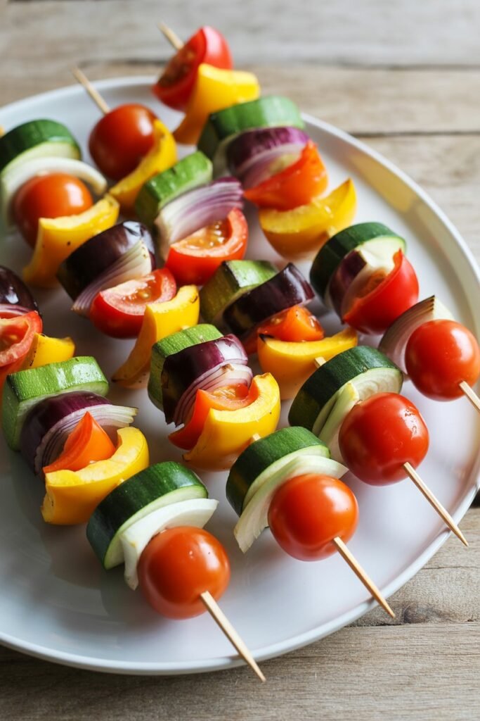 Veggie Skewers: Assemble close to serving time for the freshest taste, or store cut vegetables separately in airtight containers in the fridge for up to 2 days. Assemble skewers just before eating to keep veggies crisp.