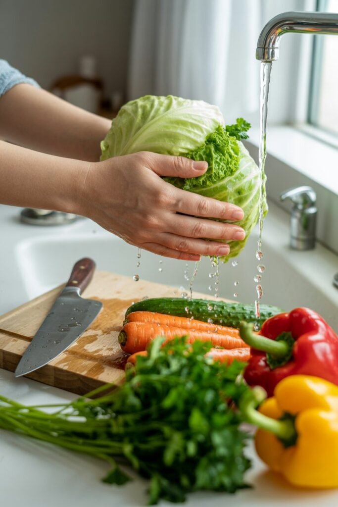 Wash the cabbage, lettuce, cucumber, bell pepper, and parsley thoroughly under cold water, then pat them dry.