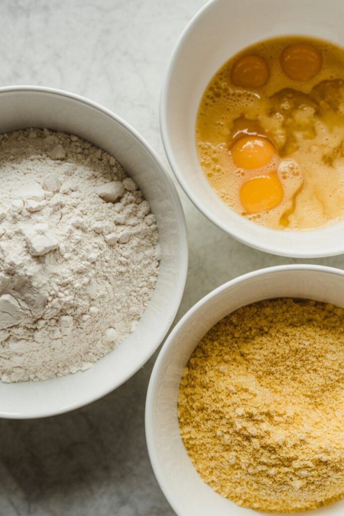 In the third bowl, add the cornmeal.