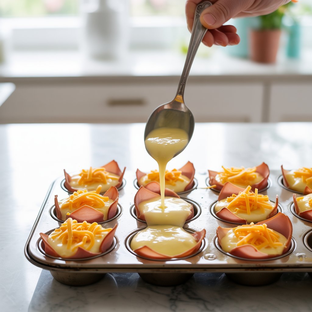 Sprinkle a little shredded cheese into each ham cup. Then pour in the egg mixture until each cup is about three-quarters full.