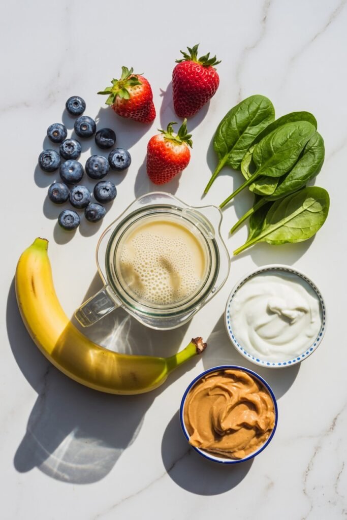 Mixed berries, banana, yogurt, and a handful of spinach for extra nutrients without strong taste.