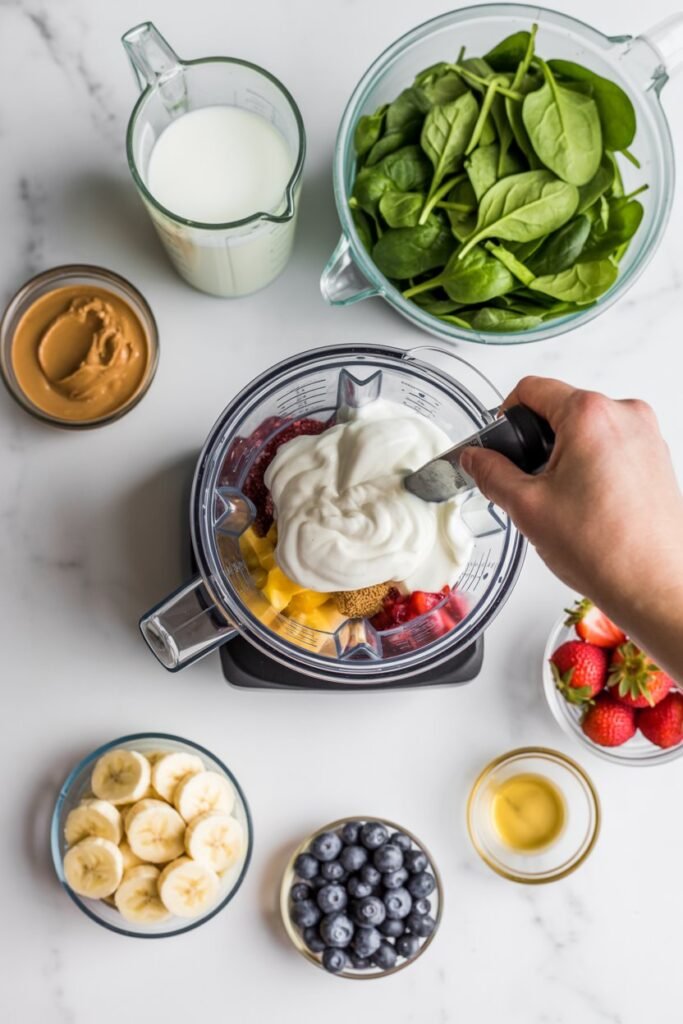 This is also the best time to sneak in extra nutrition. Add a small handful of spinach, a spoon of peanut butter, oats, chia seeds, or even a little avocado.