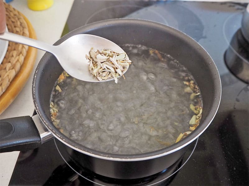 - Quick instructions on making the tea in a nutshell: 1) boil the water 2) add 1 tablespoon of herb per 1 litre/4 cups of water if one herb only / 1 tsp per herb if 3 herbs are being used to the boiling water 3) turn heat off, leave for 10 or 15 minutes and strain so the water doesn’t go bitter (the properties of the herbs would have been infused into the water)