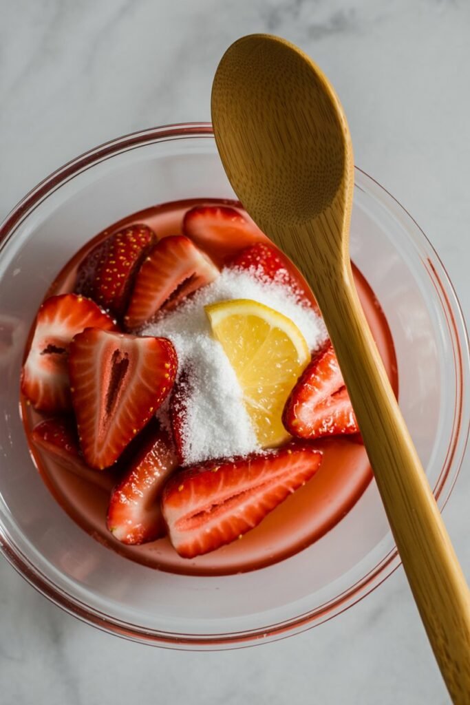 Add powdered sweetener and lemon juice. Stir gently and allow the strawberries to sit for about 10 minutes. This helps release their natural juices and creates a light syrup.