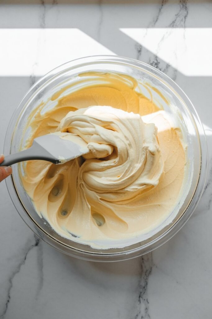 Gently fold the whipped cream into the mascarpone mixture until smooth and creamy.