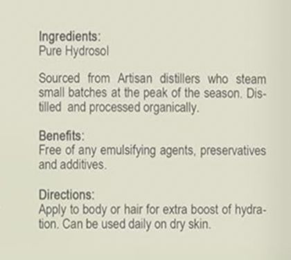 Here’s the sort of label I absolutely love. PURE HYDROSOL! Not easy to find.