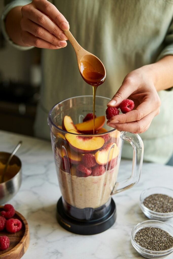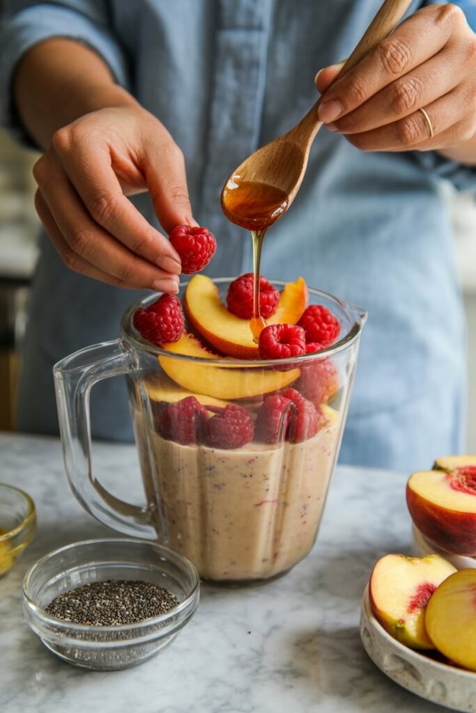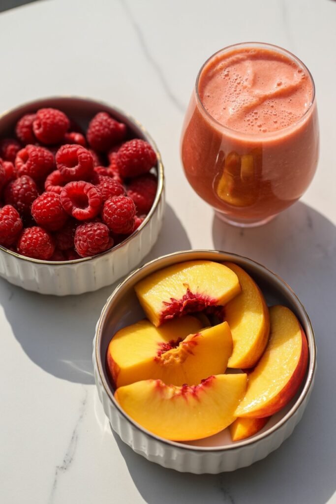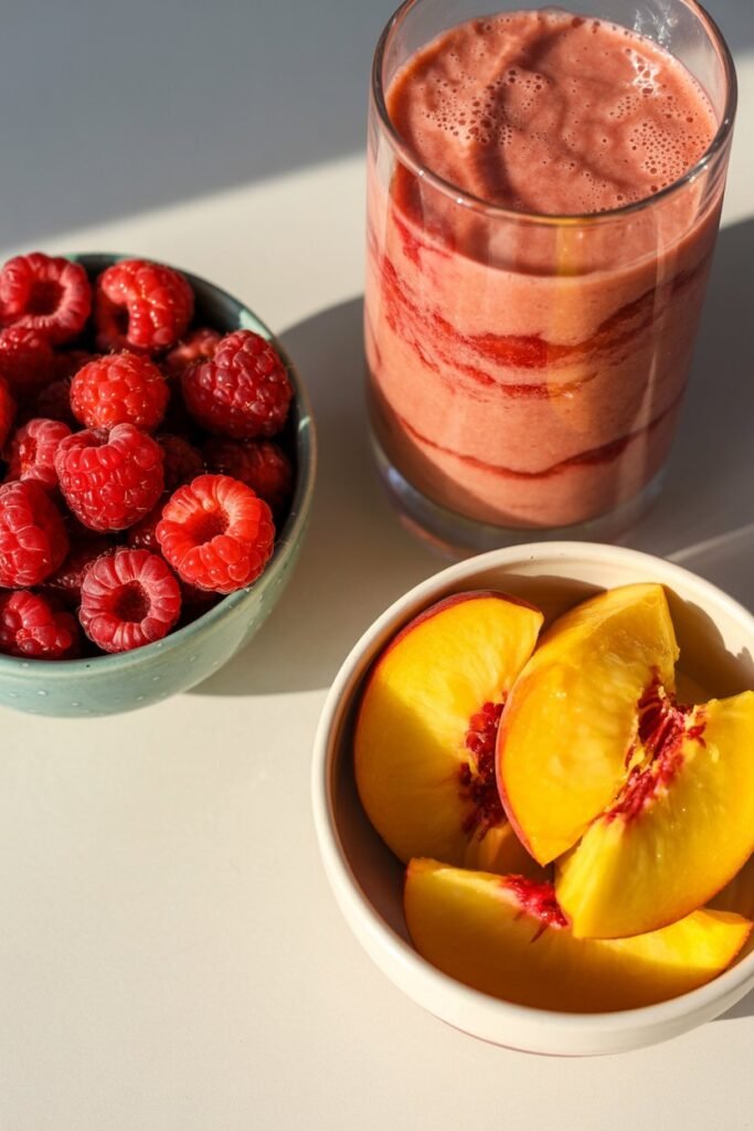 Raspberries and peaches are a perfect match in smoothies. Raspberries add a bright, slightly tart flavor that keeps the smoothie from tasting too sweet, while peaches bring natural sweetness and a smooth texture.