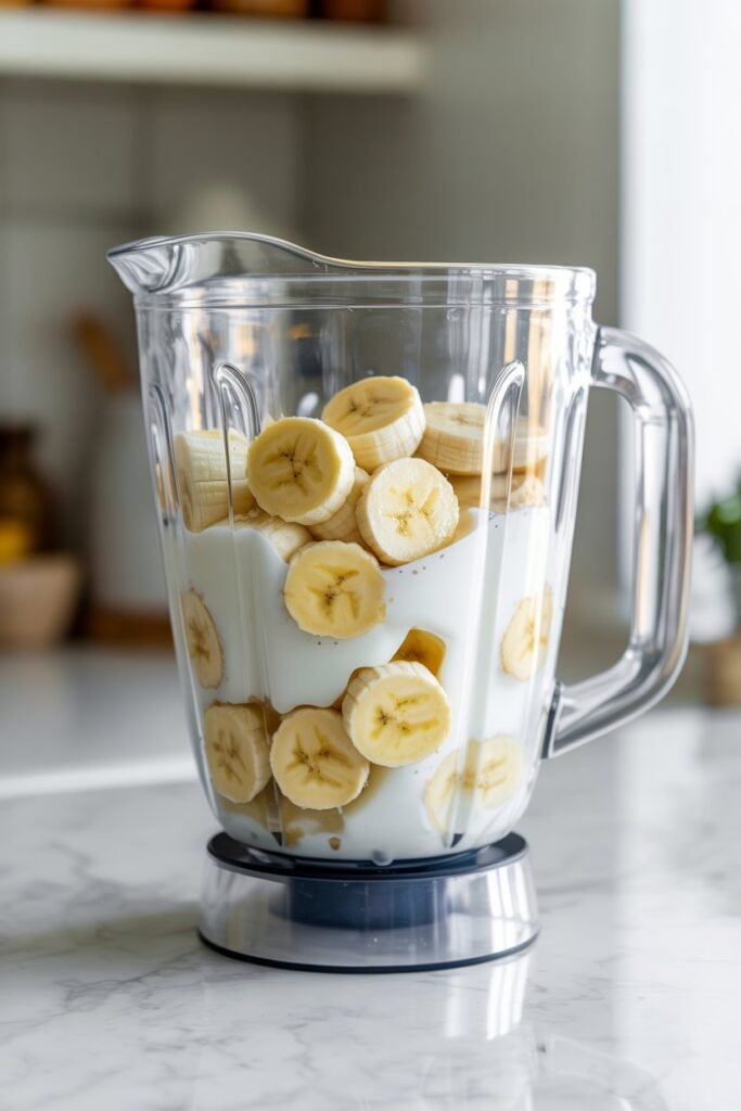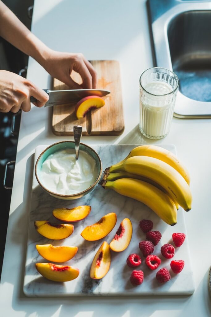Slice your banana and gather your yogurt and milk so everything is ready before blending.