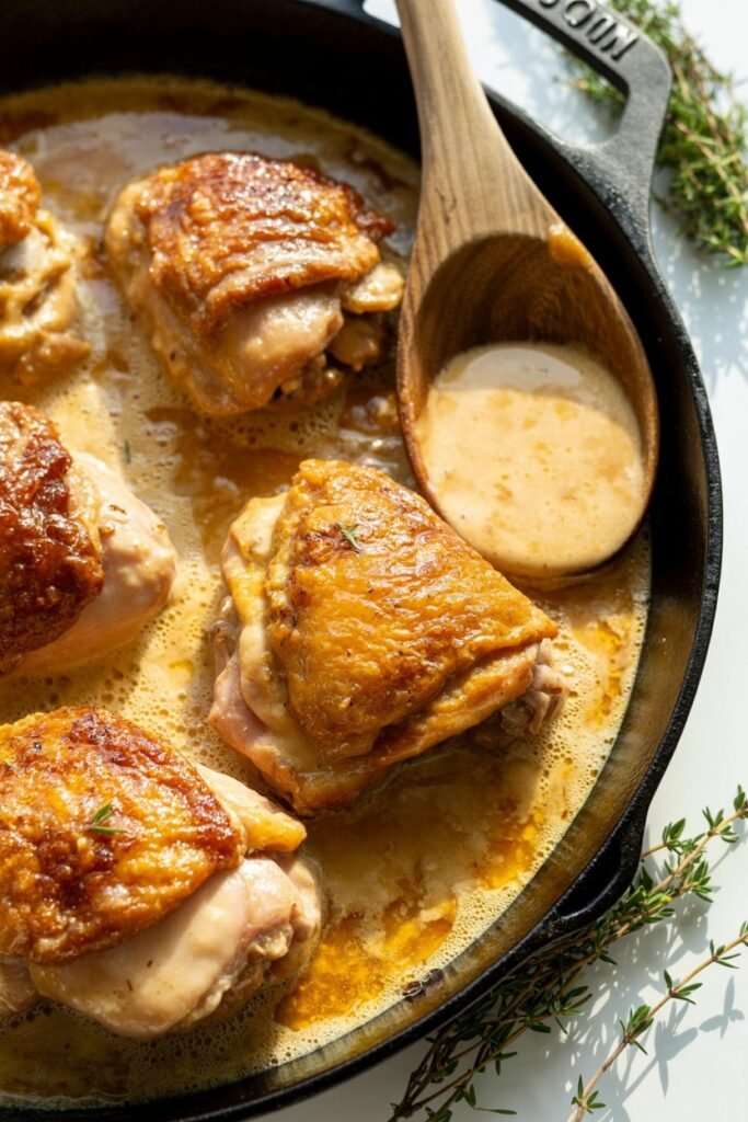 I return the seared chicken to the pan, nestling it right into the creamy gravy.