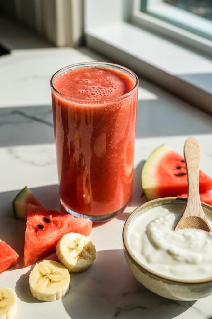 Watermelon naturally adds juicy sweetness without any added sugar, and when blended with banana and yogurt, it becomes smooth, creamy, and refreshing.