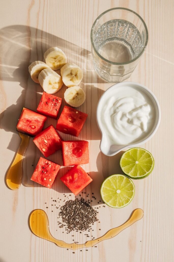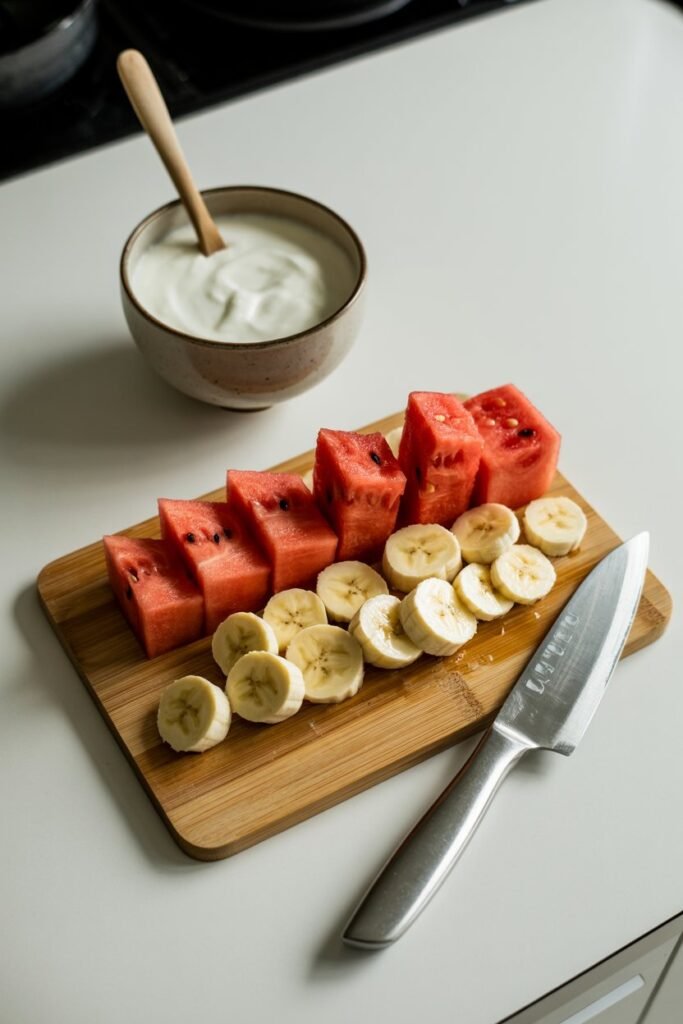 Slice the banana and gather your yogurt and coconut water or milk. If you want a colder smoothie, you can freeze the watermelon and banana ahead of time.