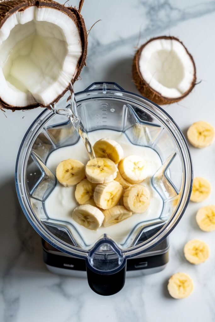 Pour your coconut water or milk into the blender first. Then add the banana and yogurt.