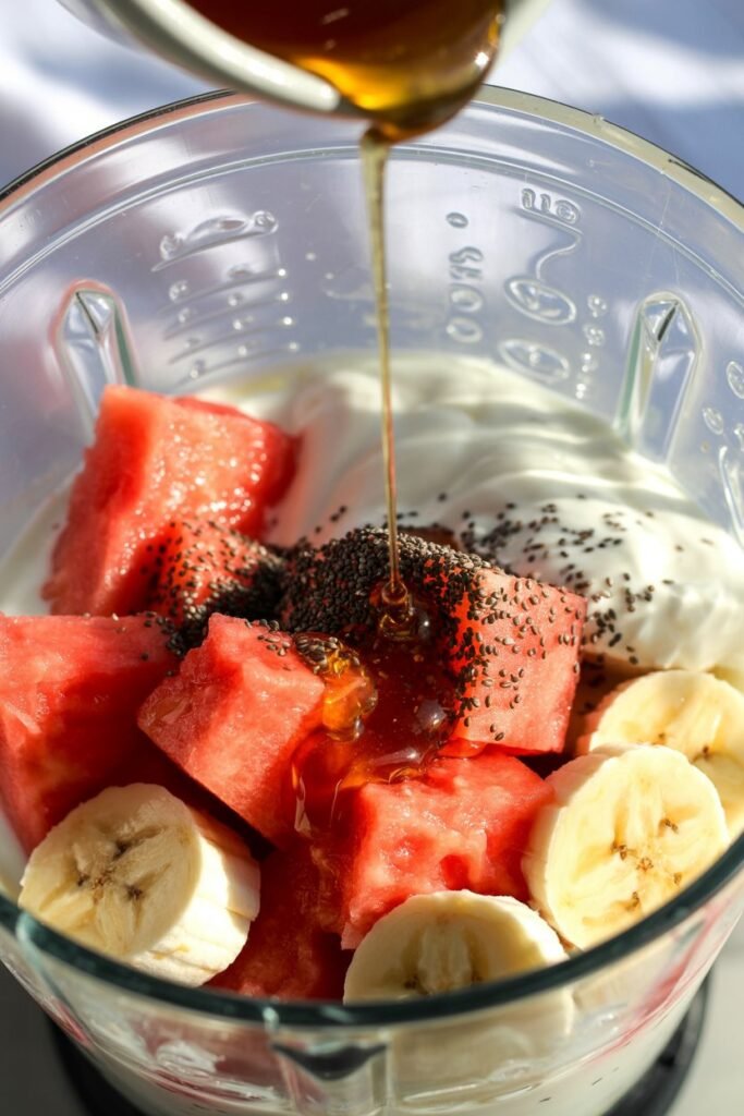 I like to layer ingredients in the blender, starting with liquid, then soft fruits like banana and yogurt, and finally the watermelon on top.