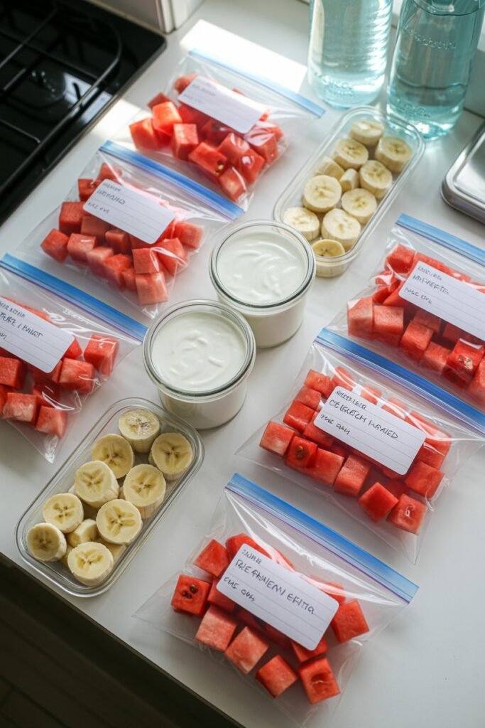 I portion watermelon and banana into single-serving freezer bags so all I have to do is add yogurt and milk and blend.