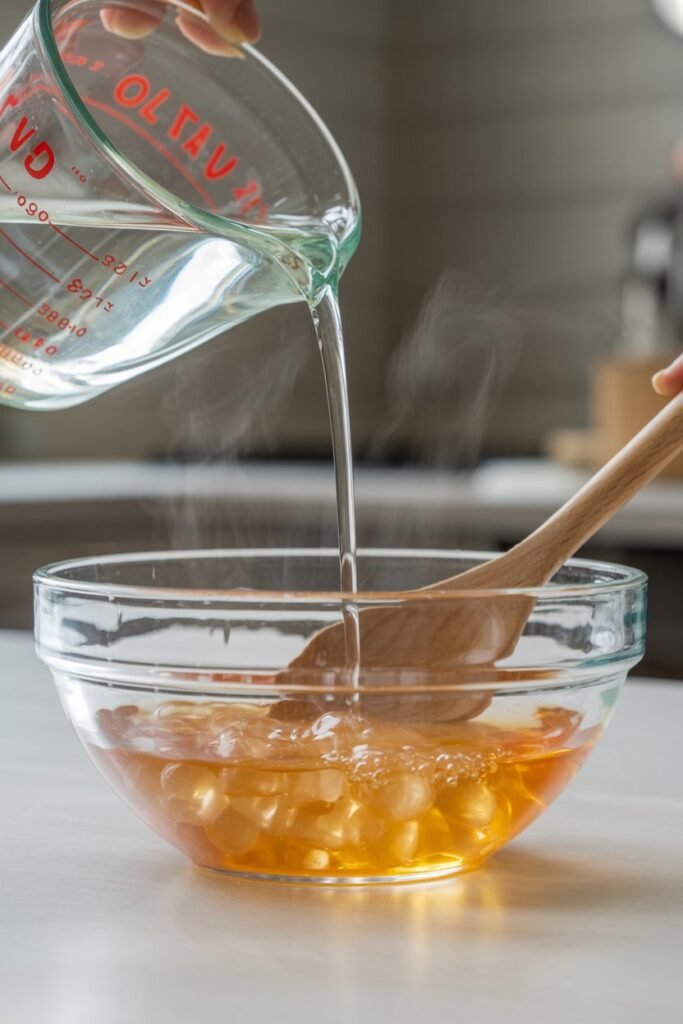 Carefully pour hot water over the bloomed gelatin. The water should be hot enough to dissolve the gelatin but not boiling, as excessive heat can weaken its setting power.