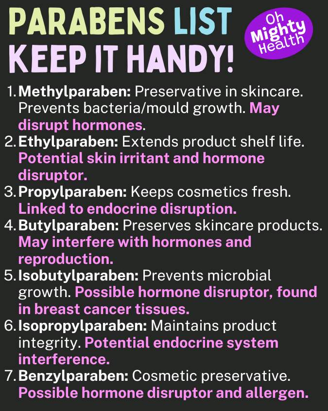 You’ll spot parabens in many cosmetics and skincare products. Their names usually end in “-paraben” (like methylparaben or butylparaben). See the list below.
