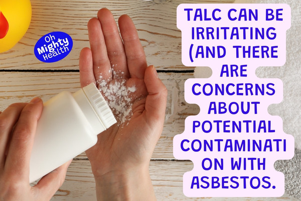 Talc absorbs moisture and has been popular for many, many years. However, some people find it irritating, and there are concerns about potential contamination with asbestos.